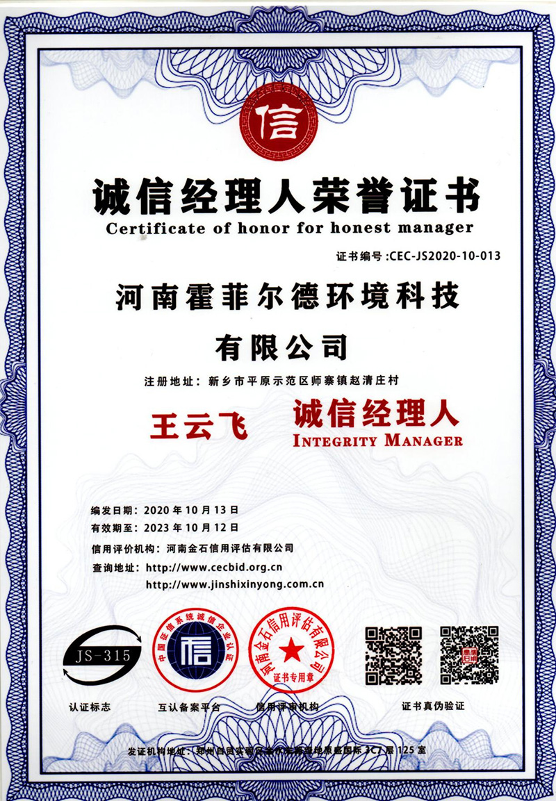 诚信经理人荣誉证书